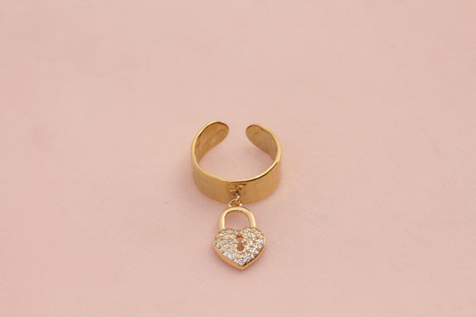 Bague acier inoxydable pampille cœur locket strass doré à l'or fin réglable