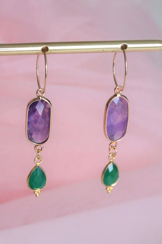 Mini créoles plaquées or pendentif améthyste et malachite