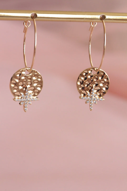 Mini créoles plaquées or avec pendentif sequin martelé et rose des vents