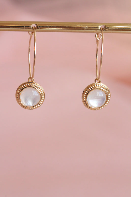 Mini créoles plaquées or avec pendentif disque cabochon nacre