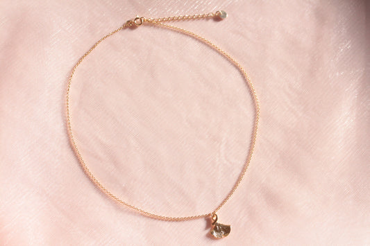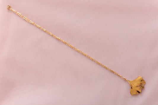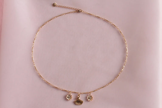 Collier chaine gingko et fleurs plaqués or, chaine en laiton doré à l'or fin